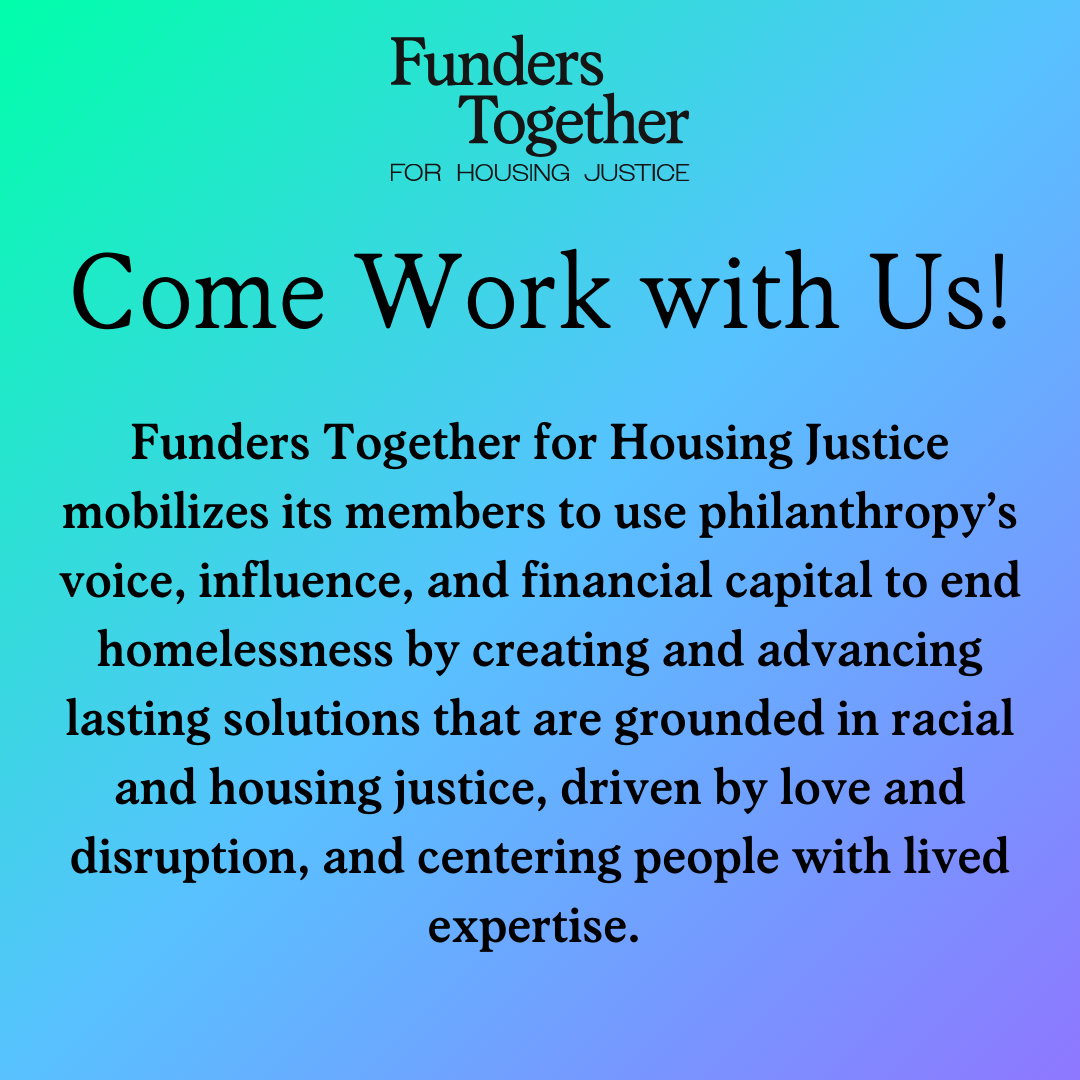 Funders Together for Housing Justice seeks to support our partners and members in finding strong candidates in the work for housing justice. To live our commitment to racial equity, we also seek to promote equitable hiring practices that will allow more people of color, people with lived experience, and LGBTQ folks to find positions at organizations that are committed to equity.