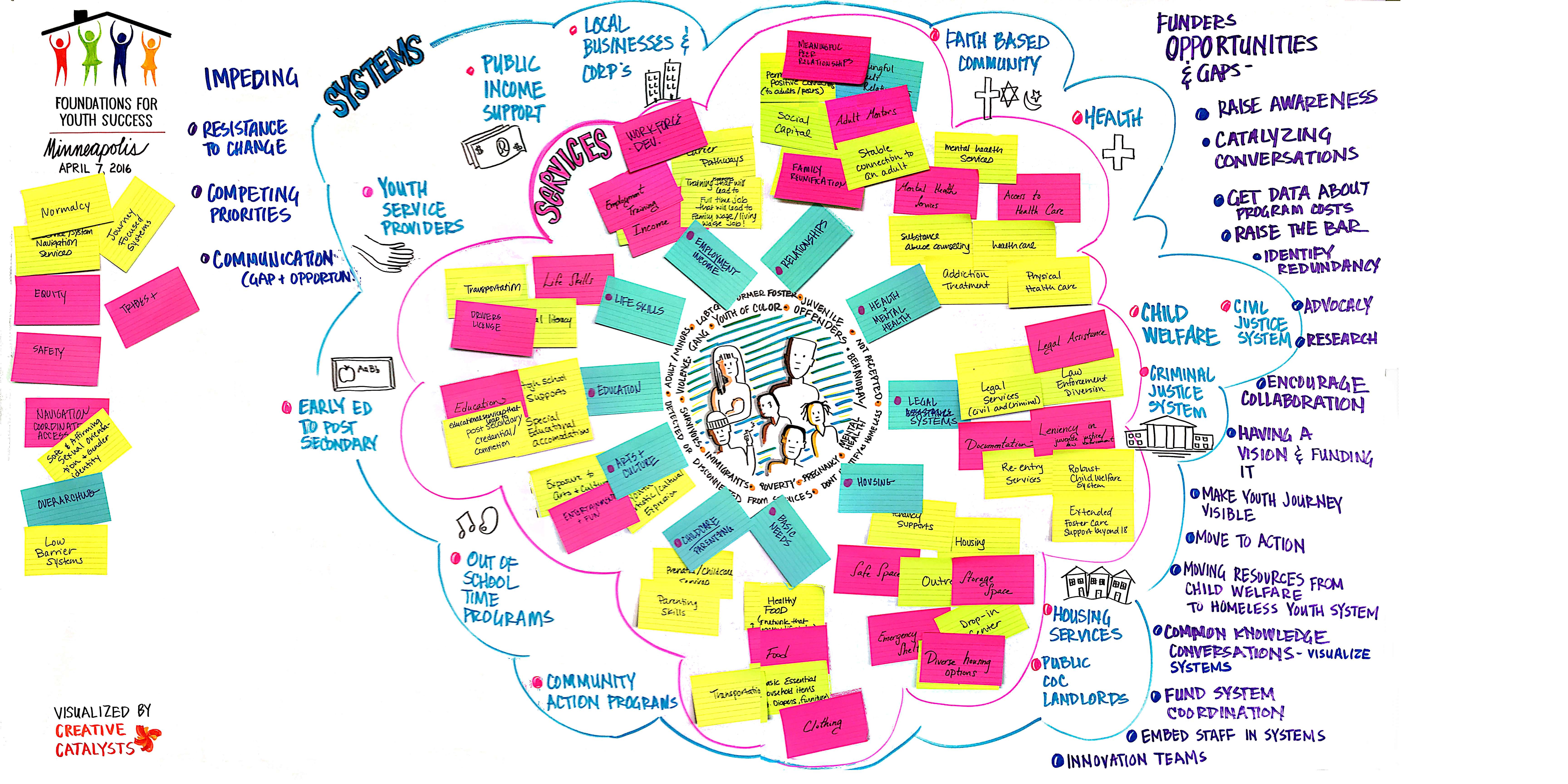 The final image is below. After creating our map we reflected by identifying opportunities and gaps that funders could fill as well as impediments that were keeping us from providing necessary services for youth.